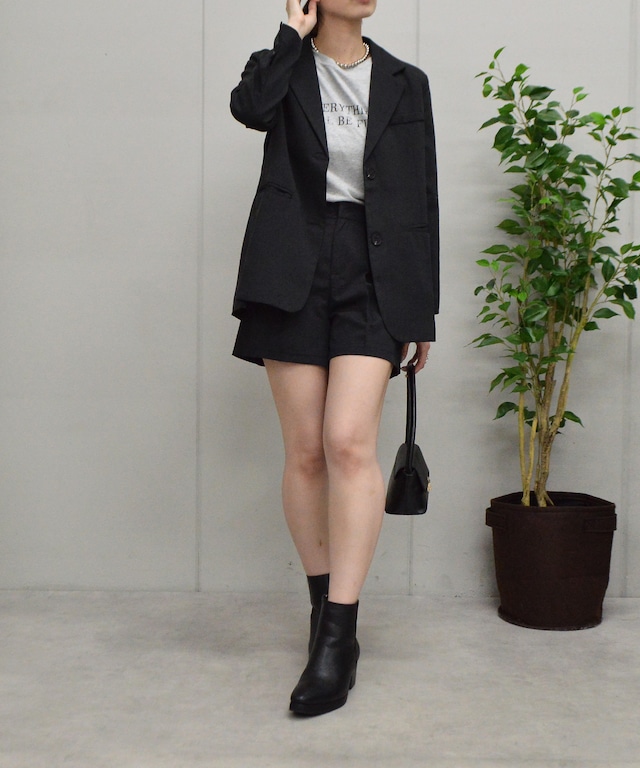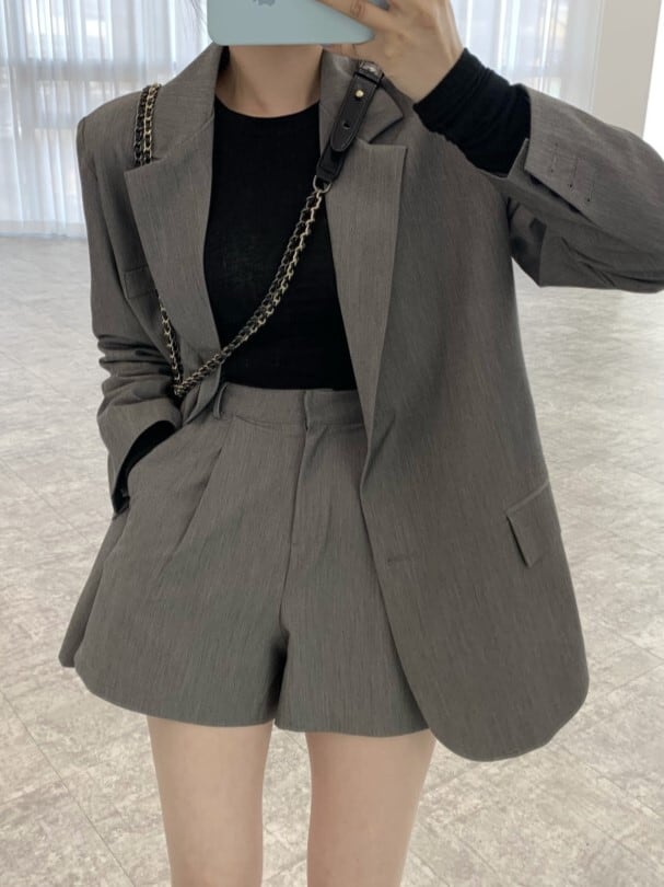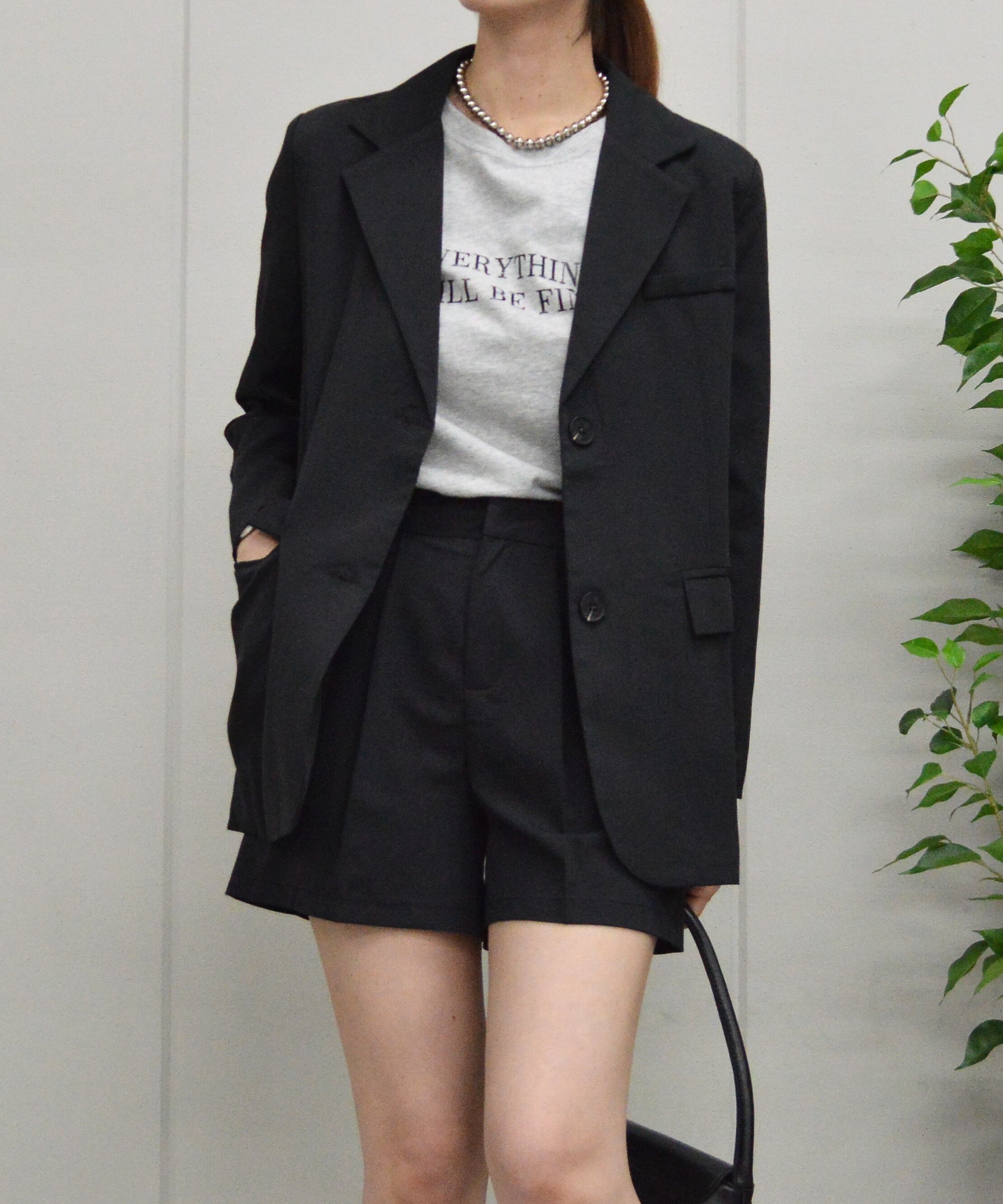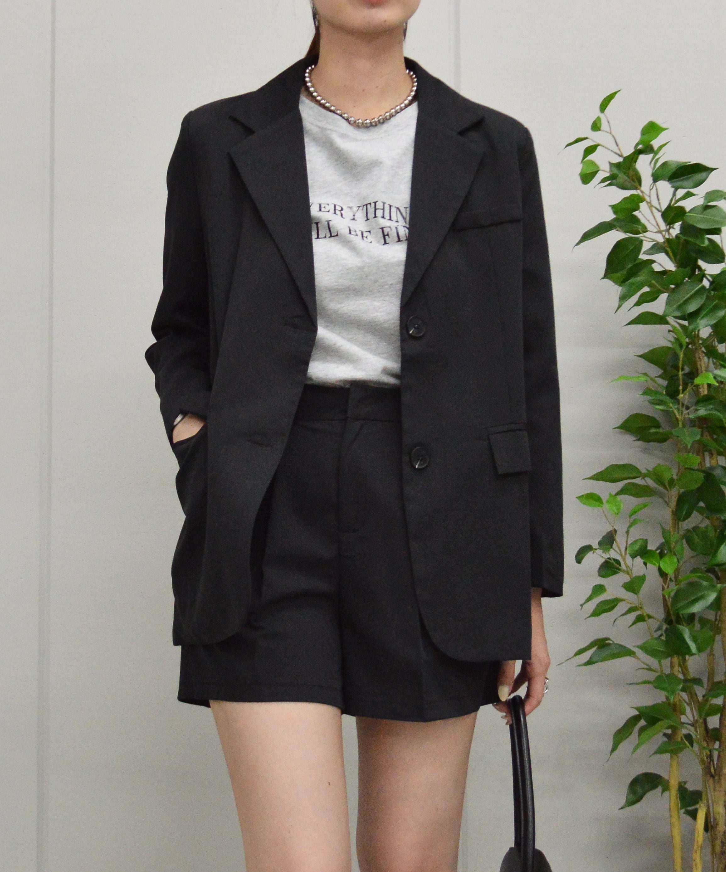 ・ややオーバーサイズのジャケットと、ハイウエストなショートパンツでカジュアル要素もプラスされた、トレンド感のあるセットアップ