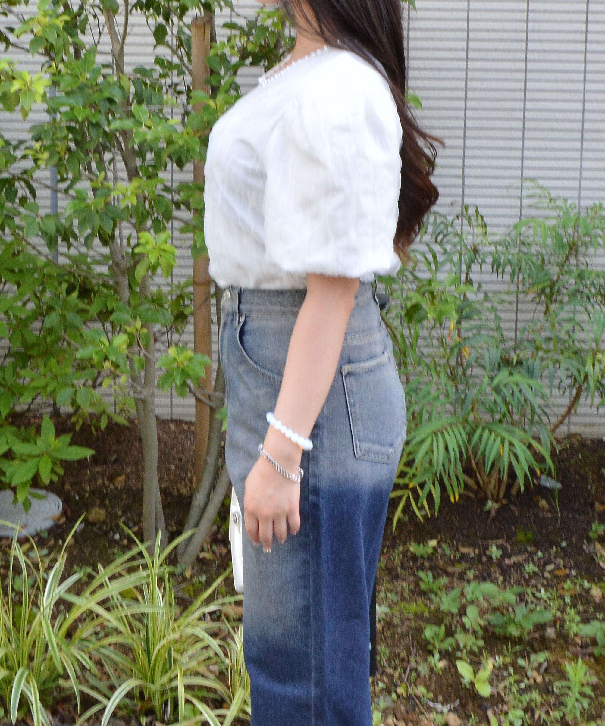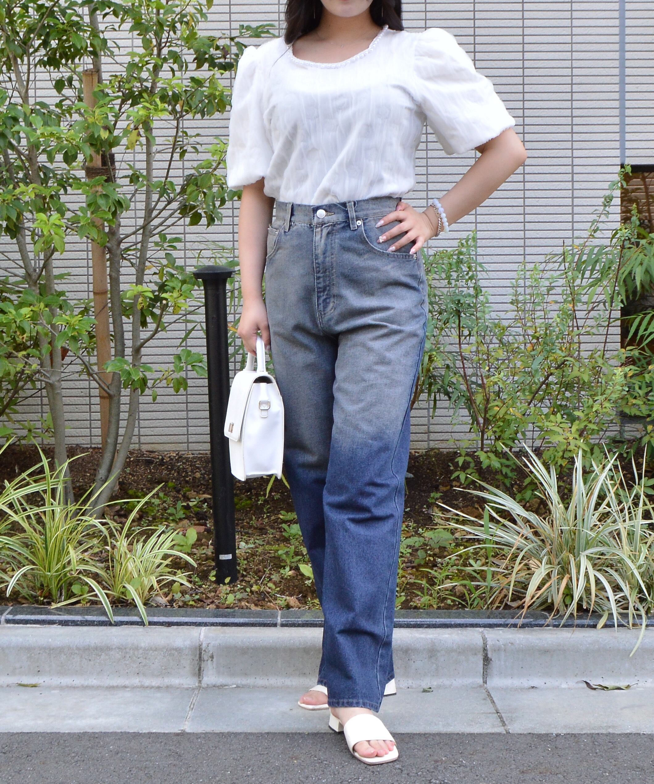 袖のパフスリーブやブラウスの立体感のある素材がフェミニンな雰囲気に仕上げてくれる一枚。