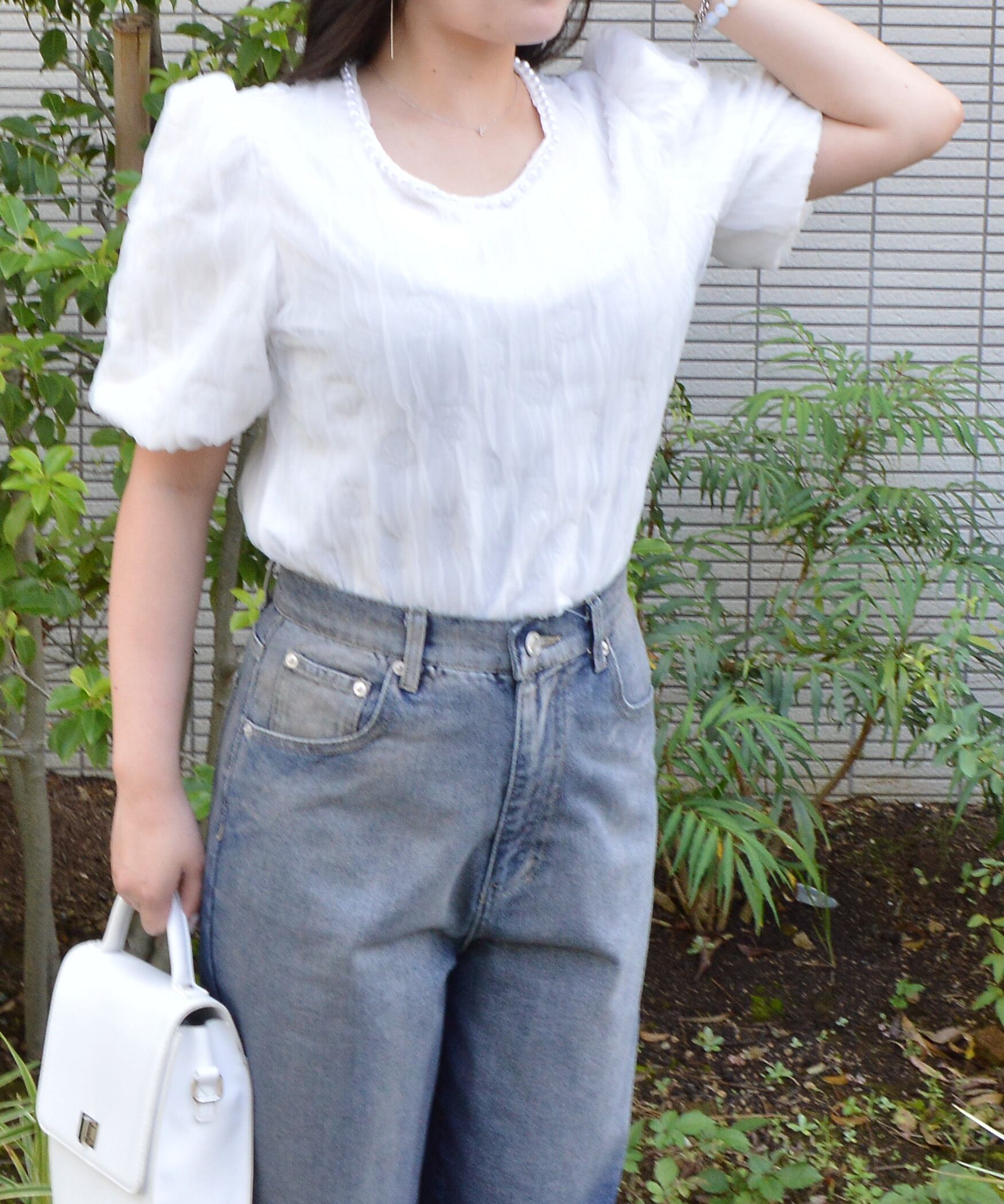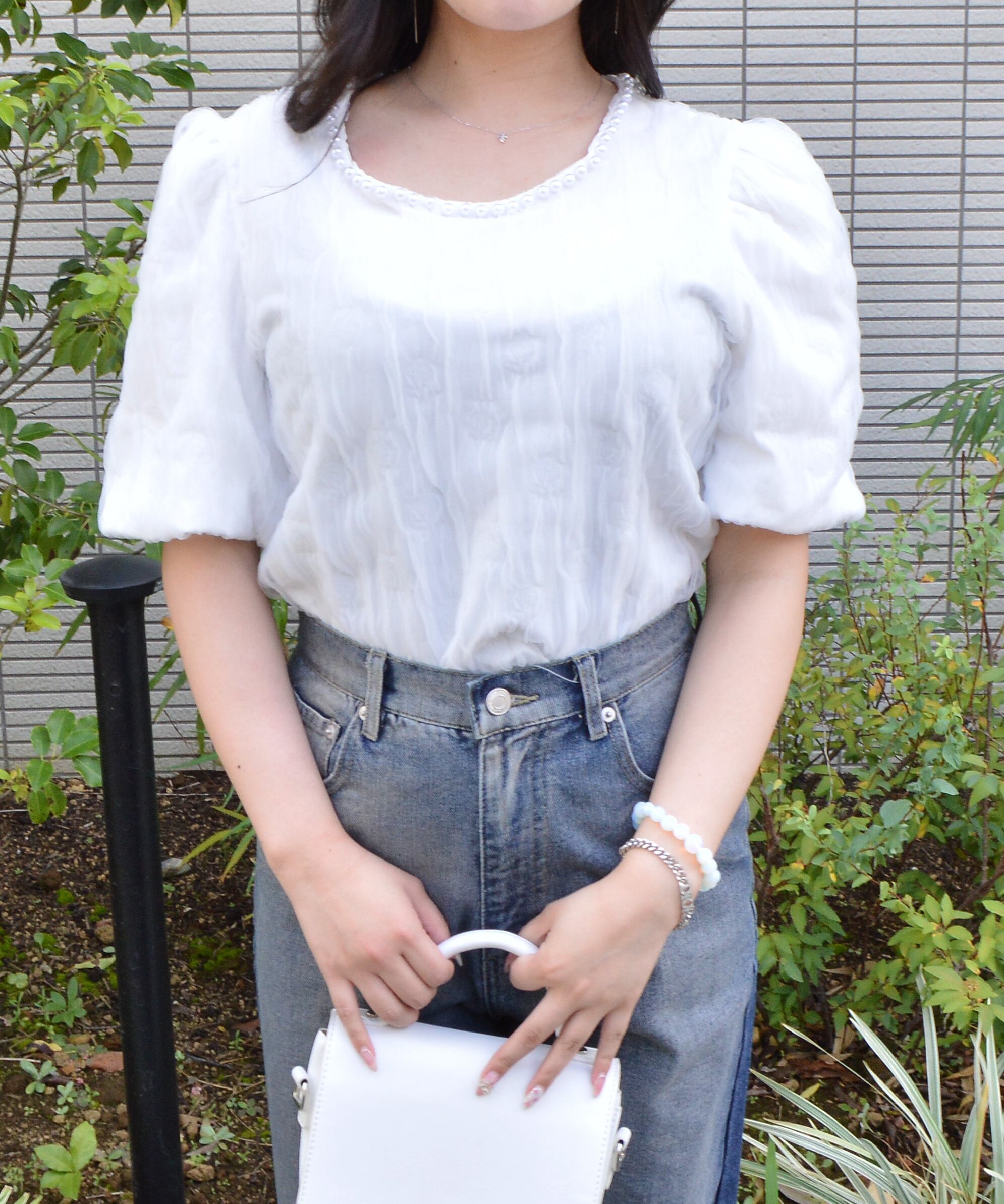 首元のパールがネックレスのように華やかで、エレガントな印象を与えてくれるレースブラウス。