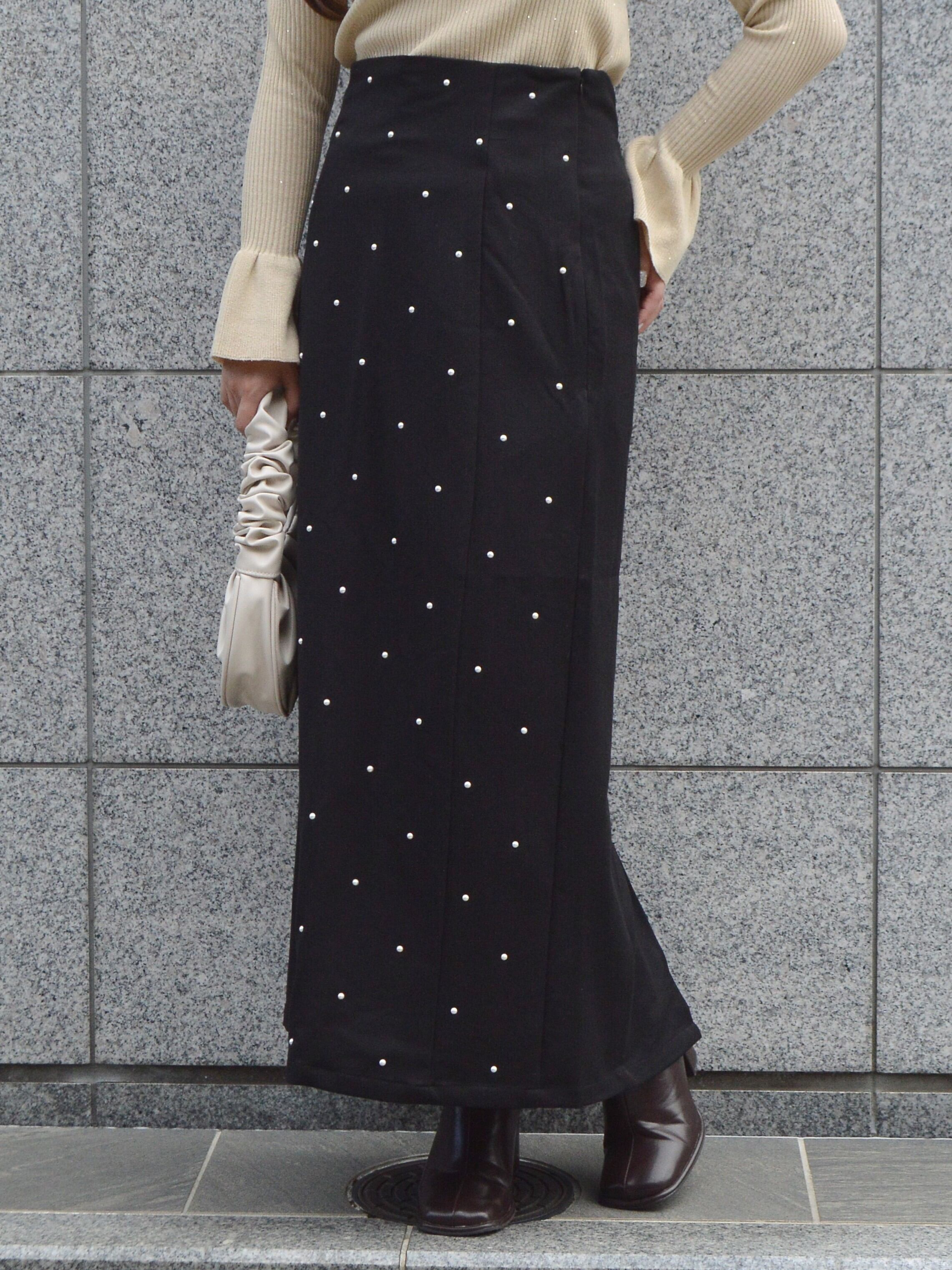 【前面パールで華やかにきらめく、大人フェミニンなタイトスカート】