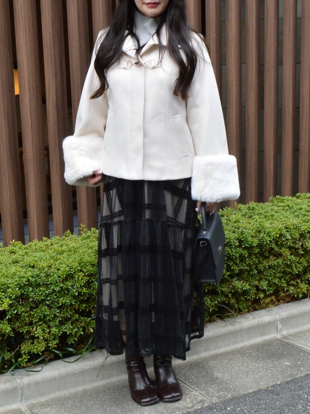 ・袖口にボリュームのあるフェイクファーカフをあしらった華やかなデザイン