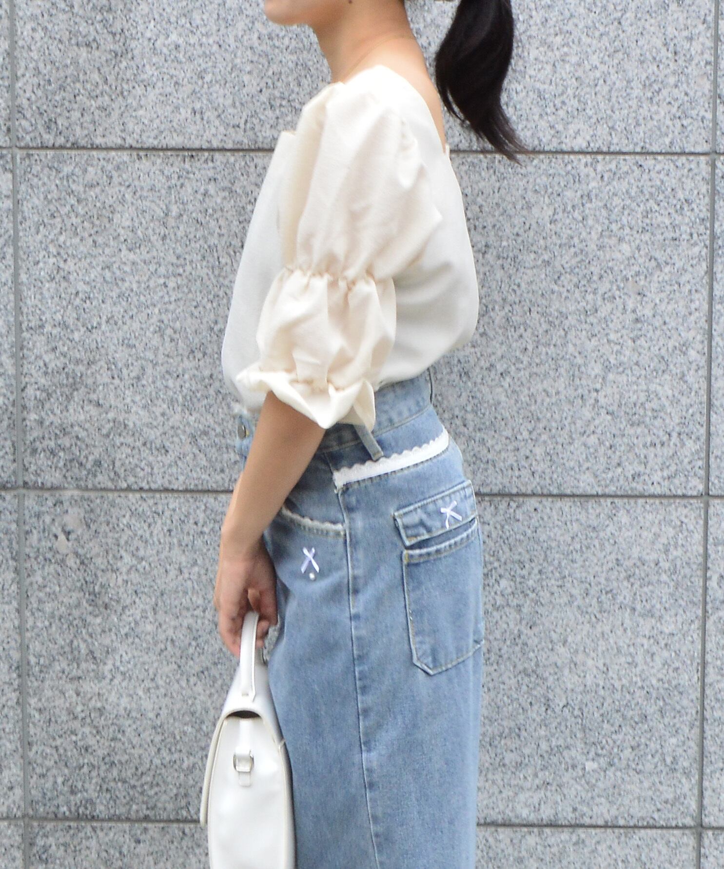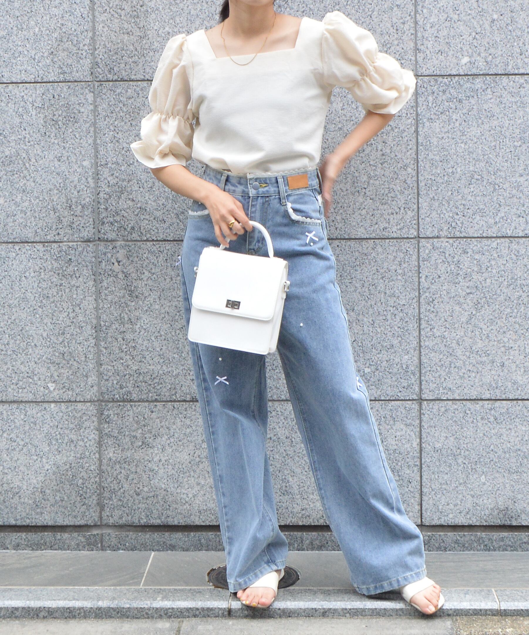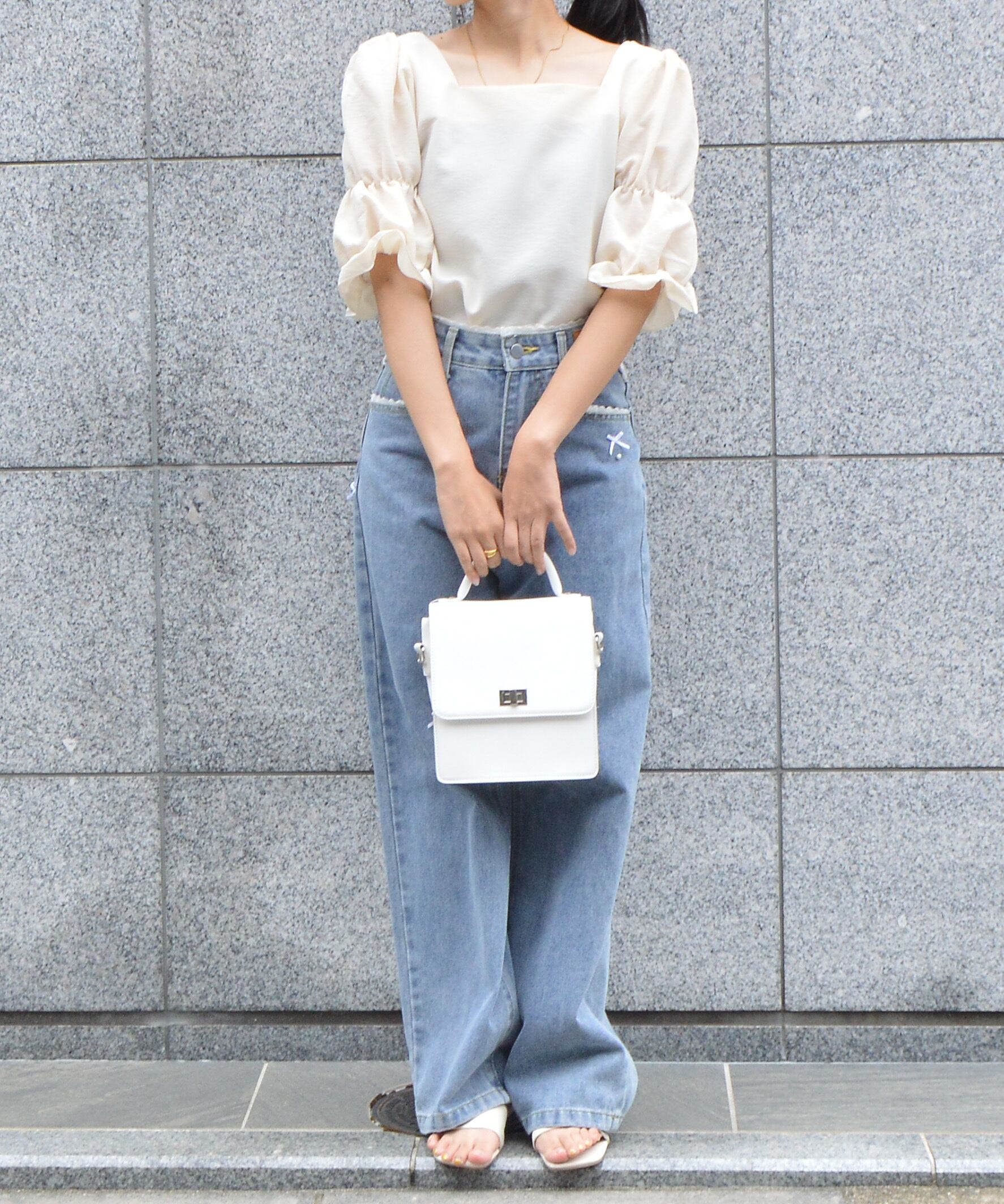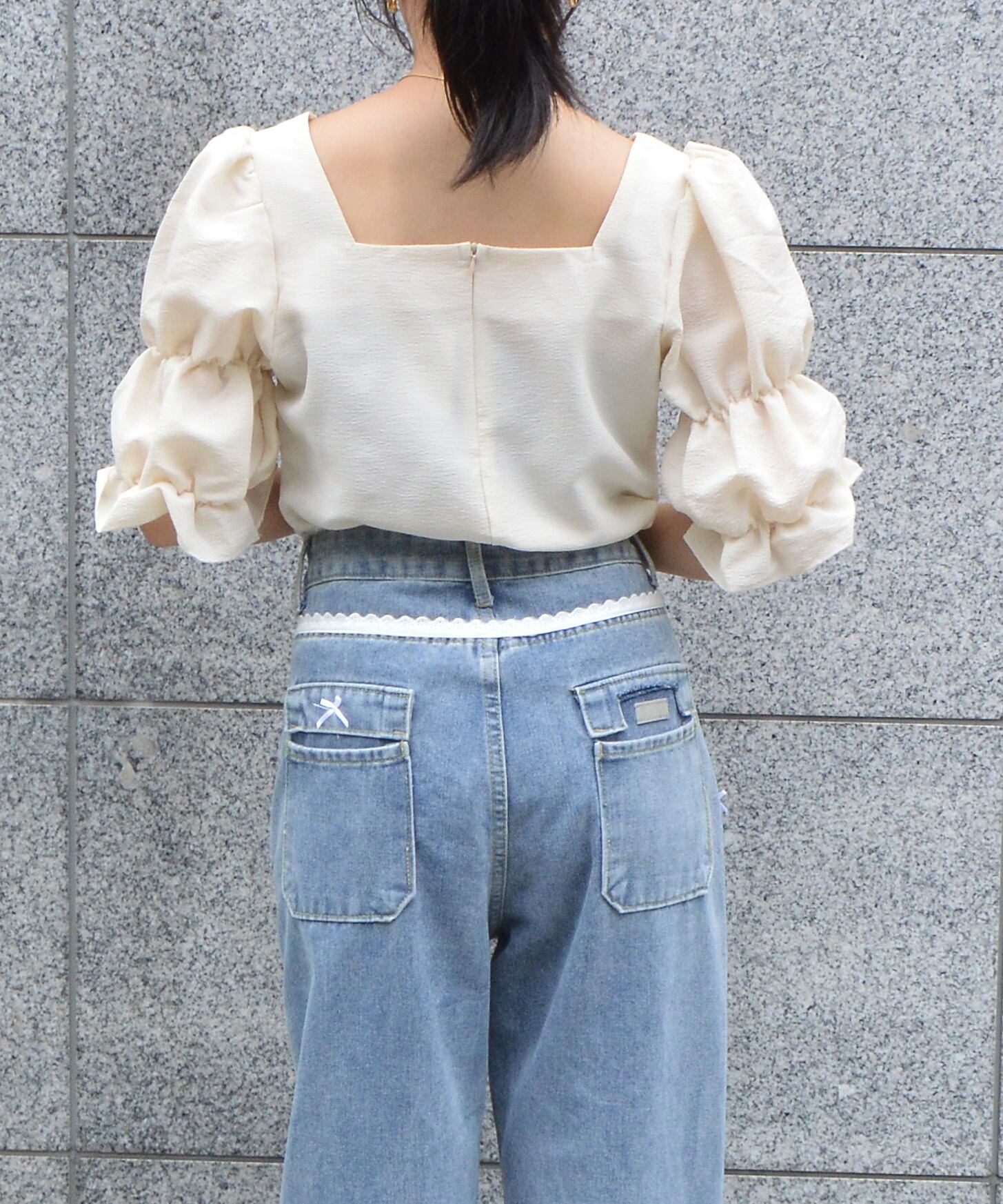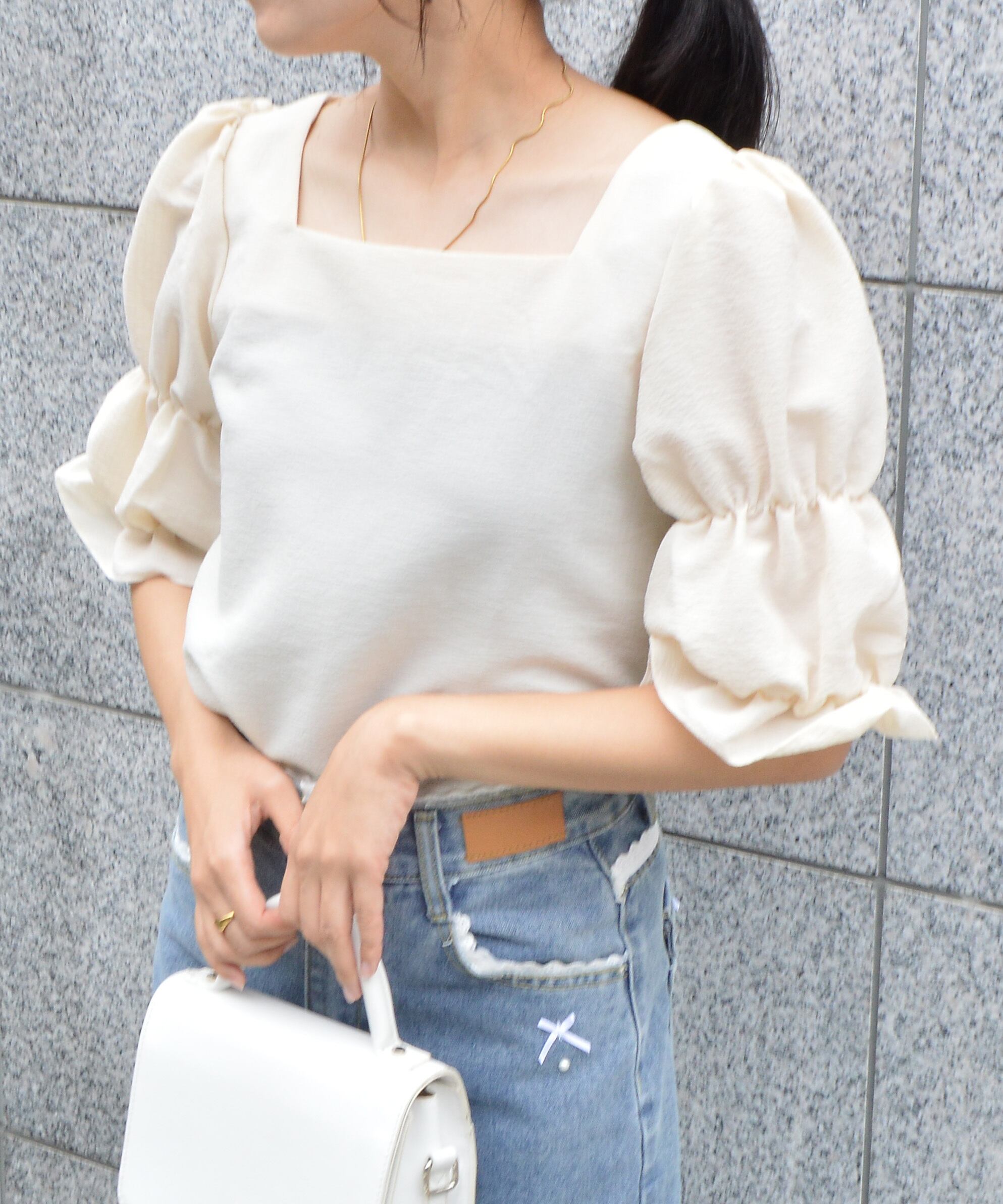 パフスリーブのバランスが魅力のスクエアネックブラウス。