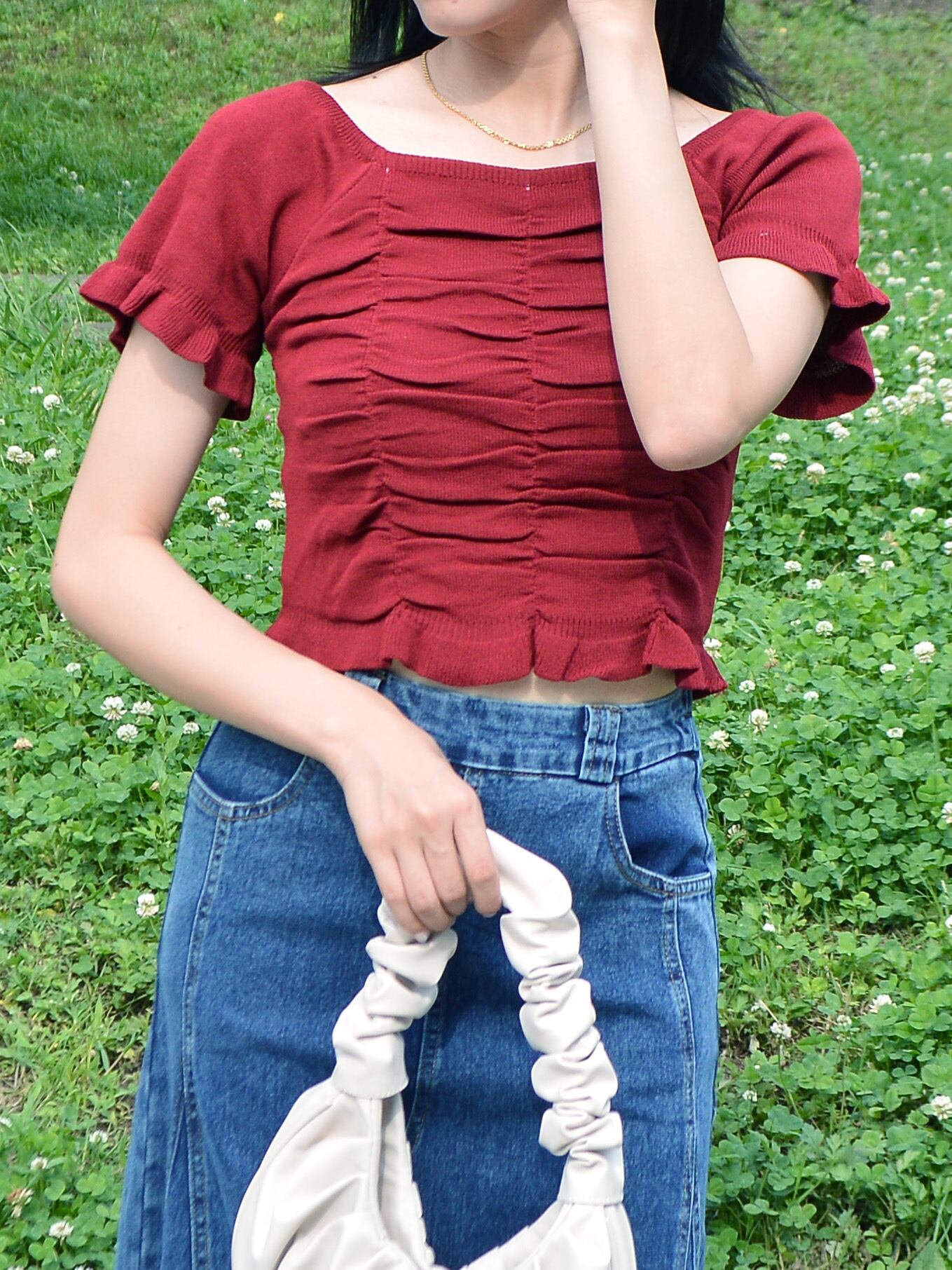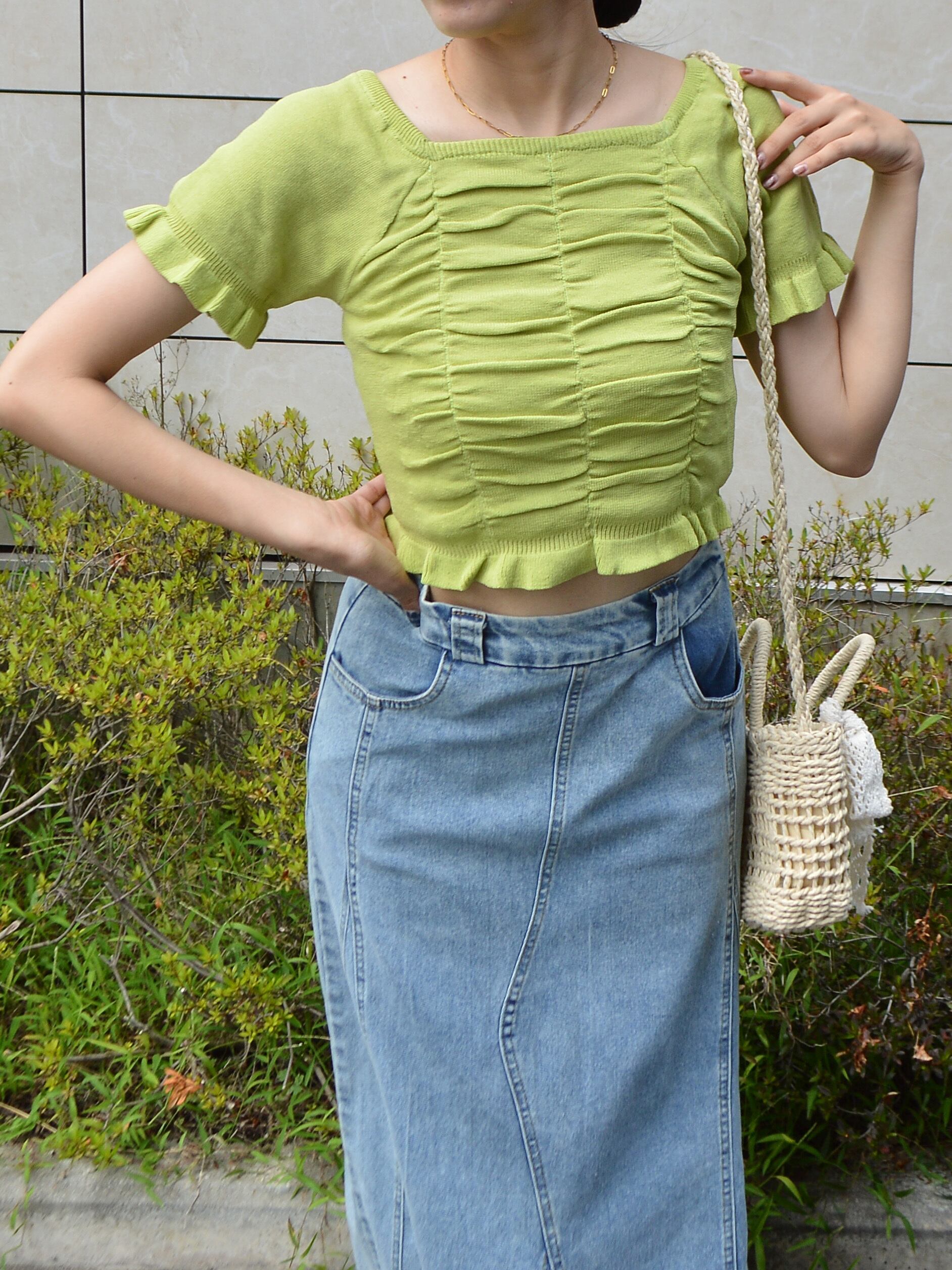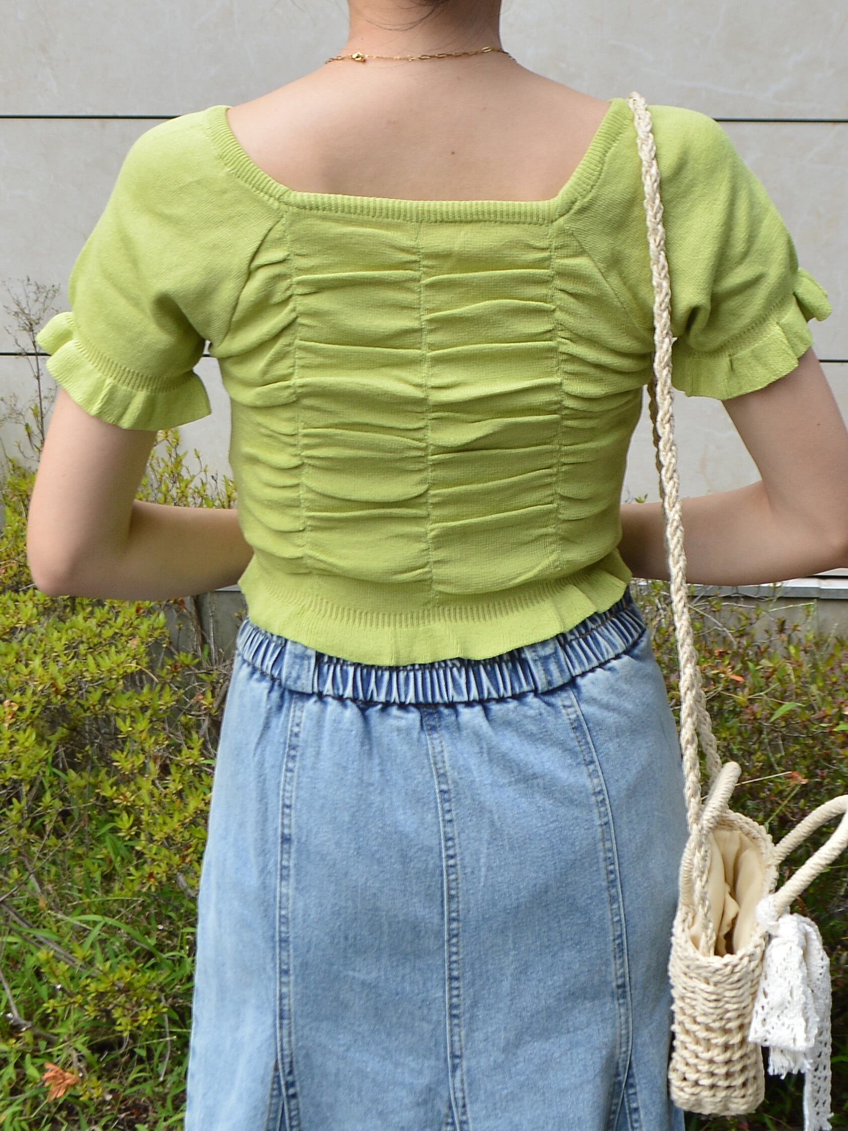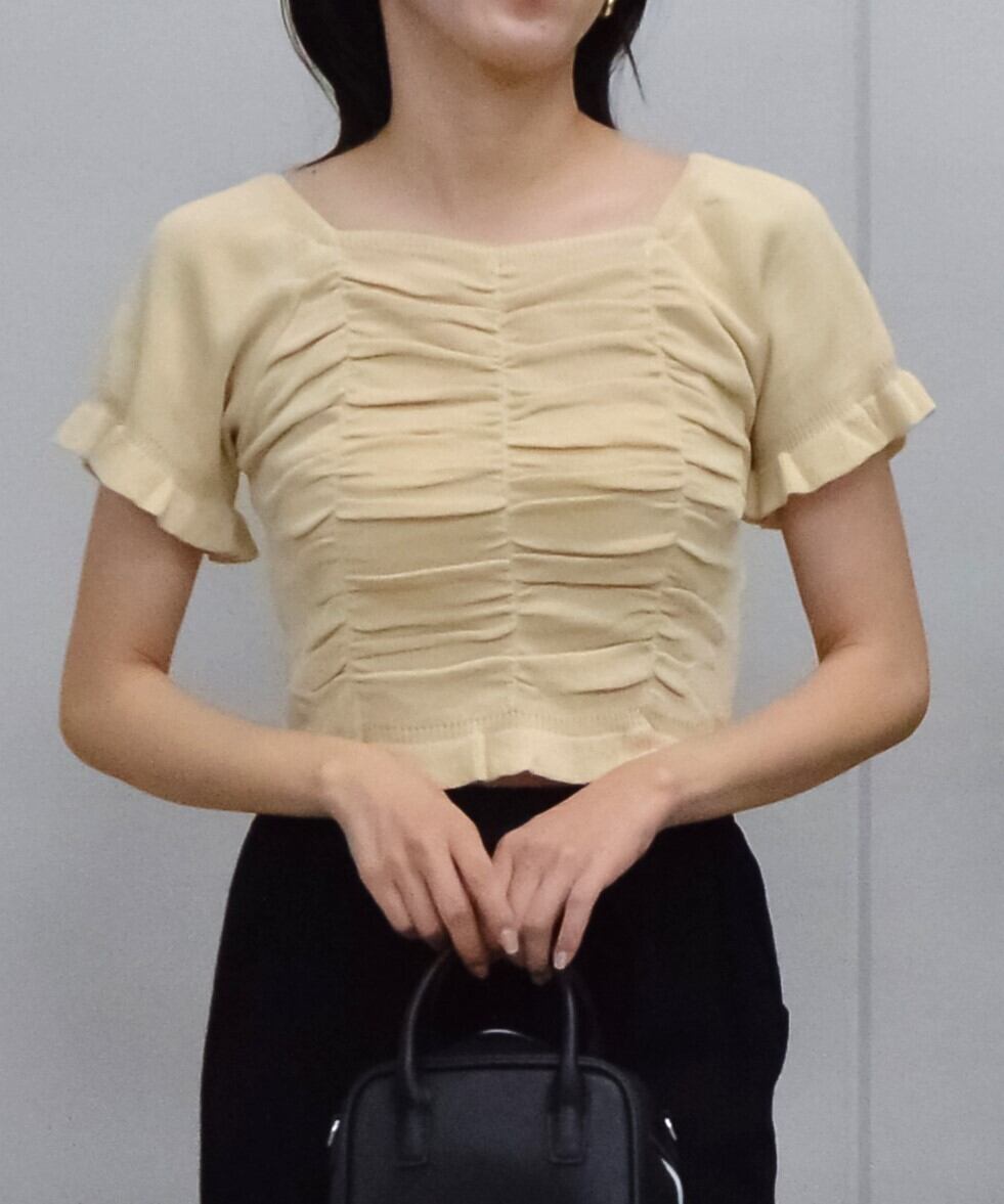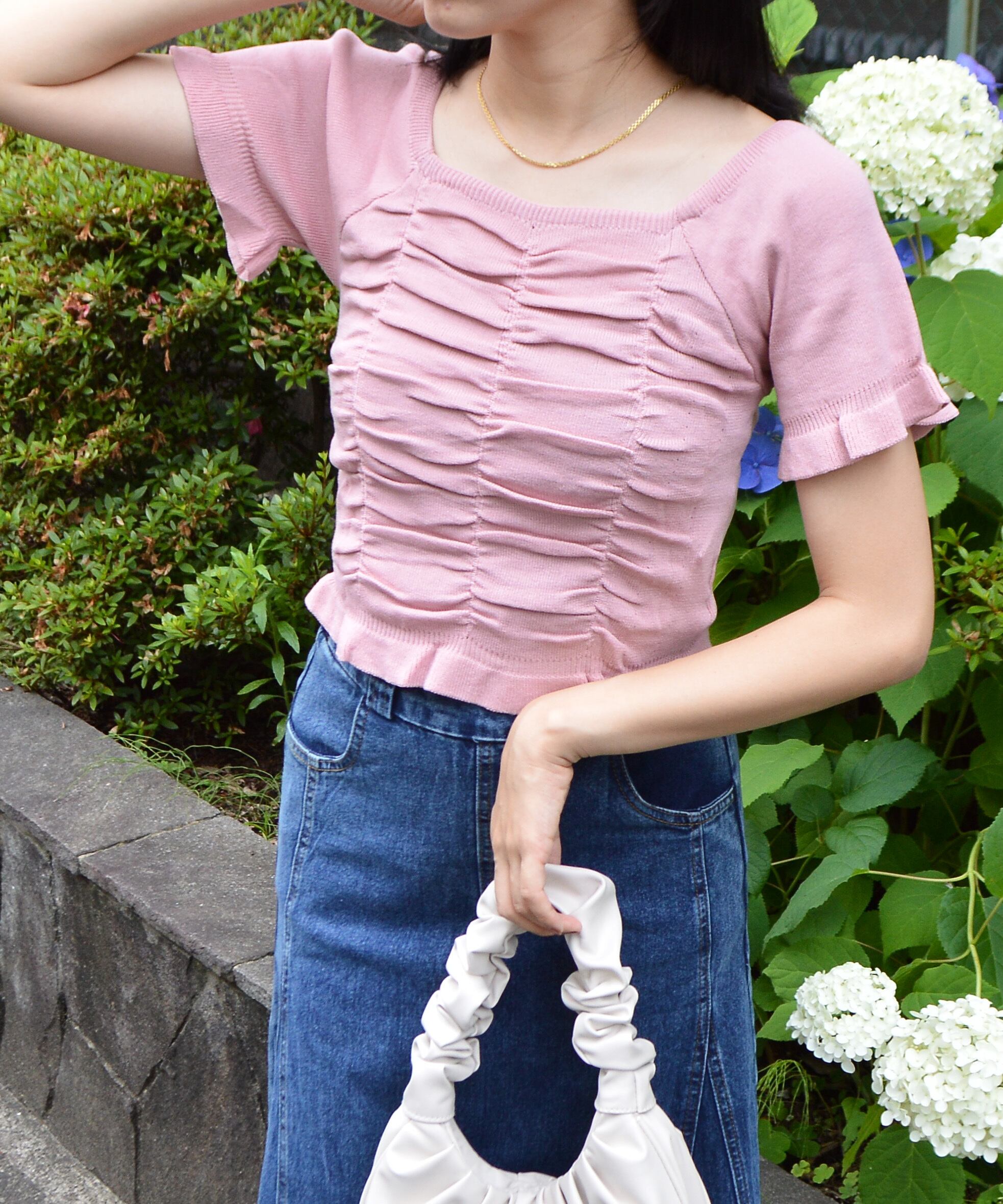 サマーニット スクエアネックトップス スクエアネックニットトップス ギャザーニットトップス 半袖