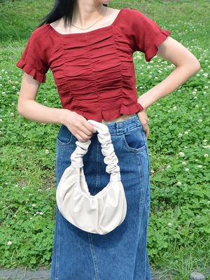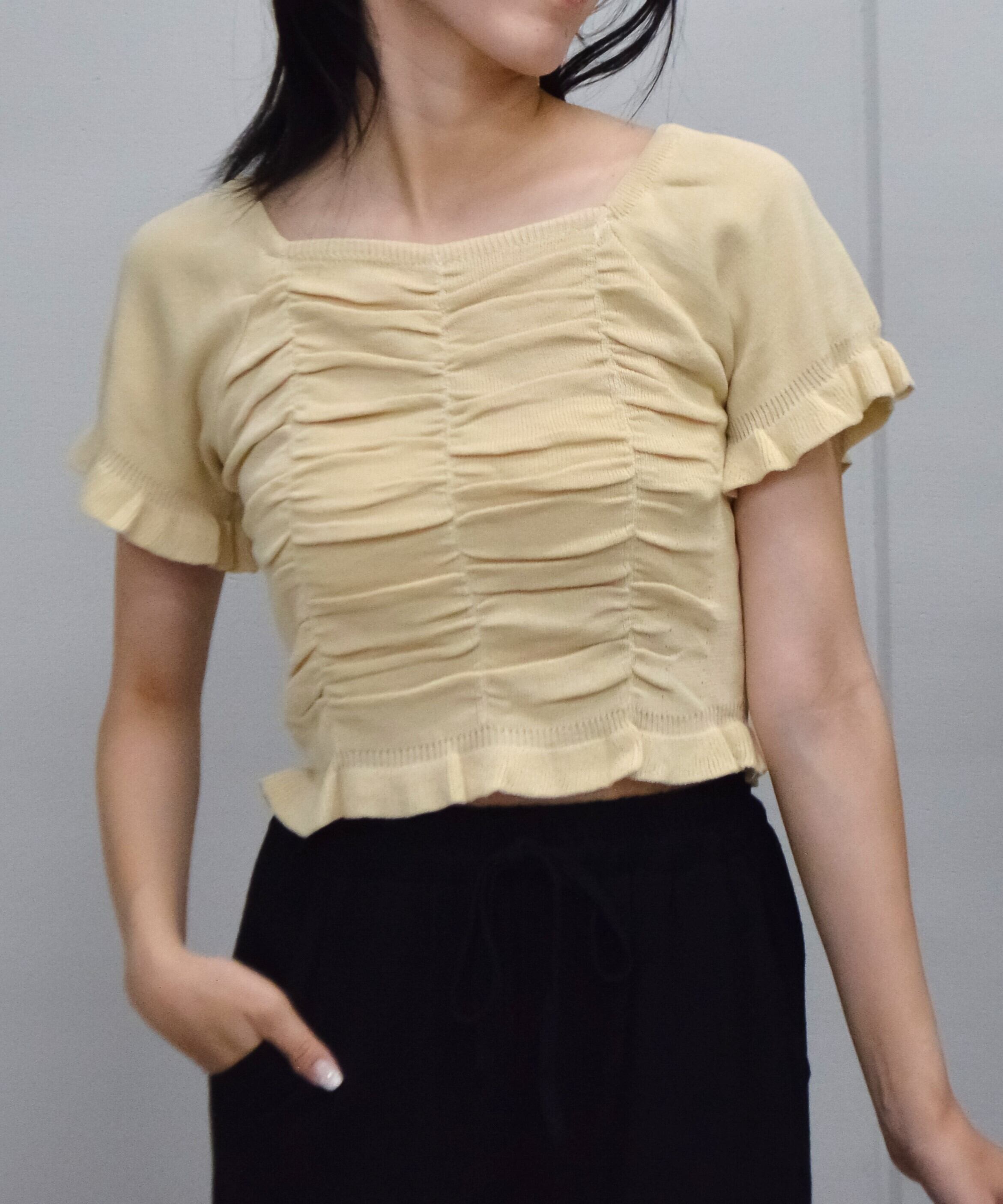 トレンドのスクエアネックと全体のギャザーがキュートなニットプルオーバー★