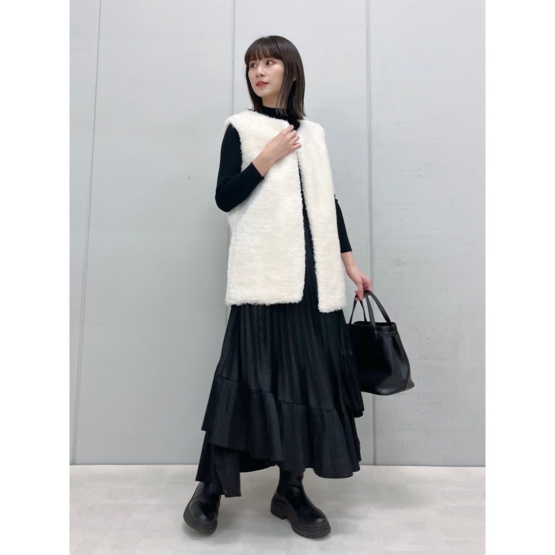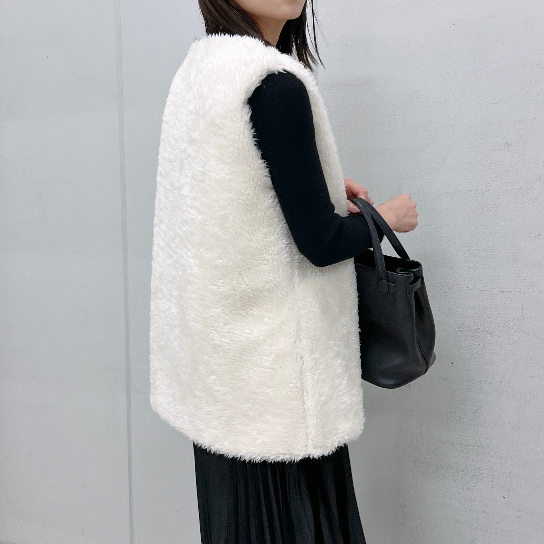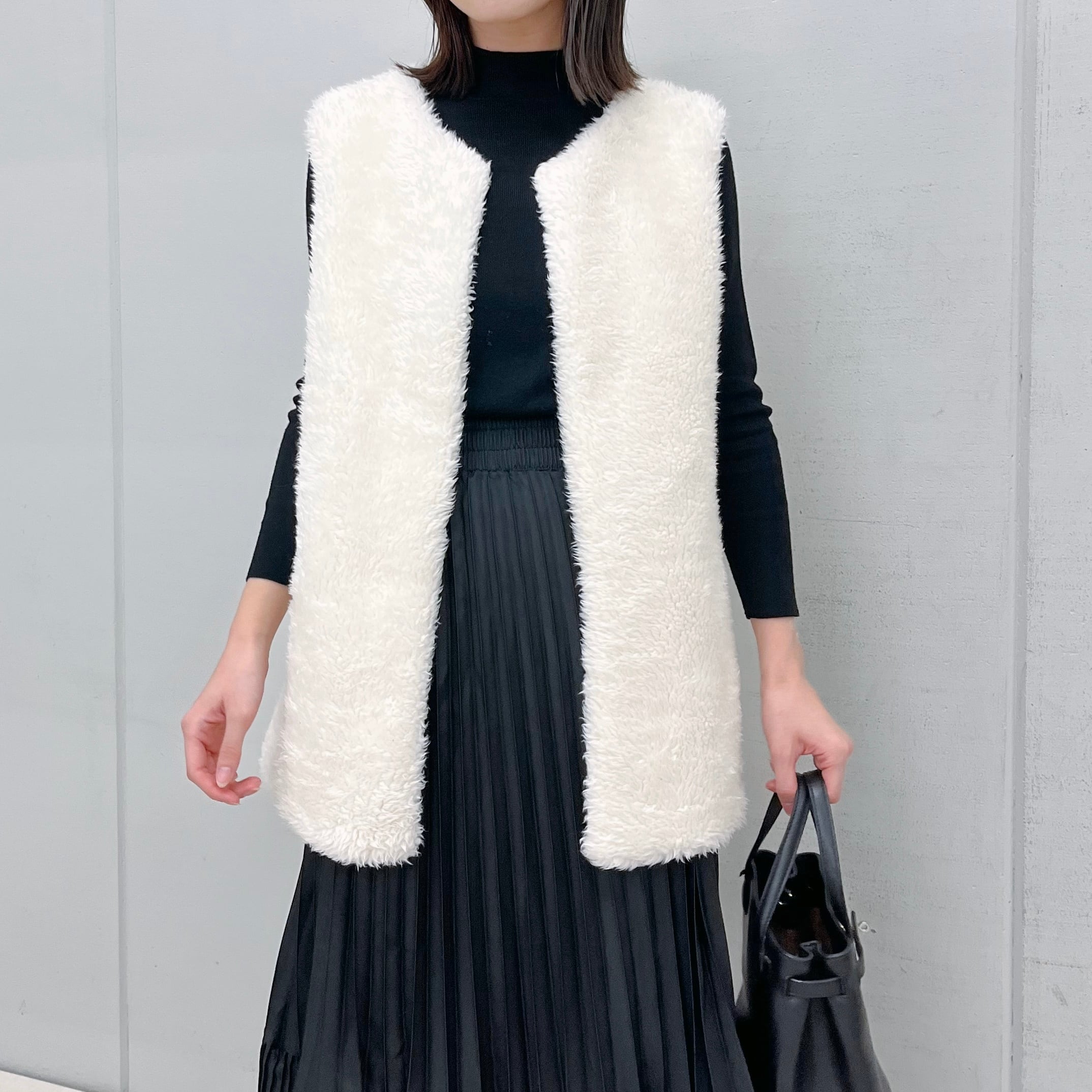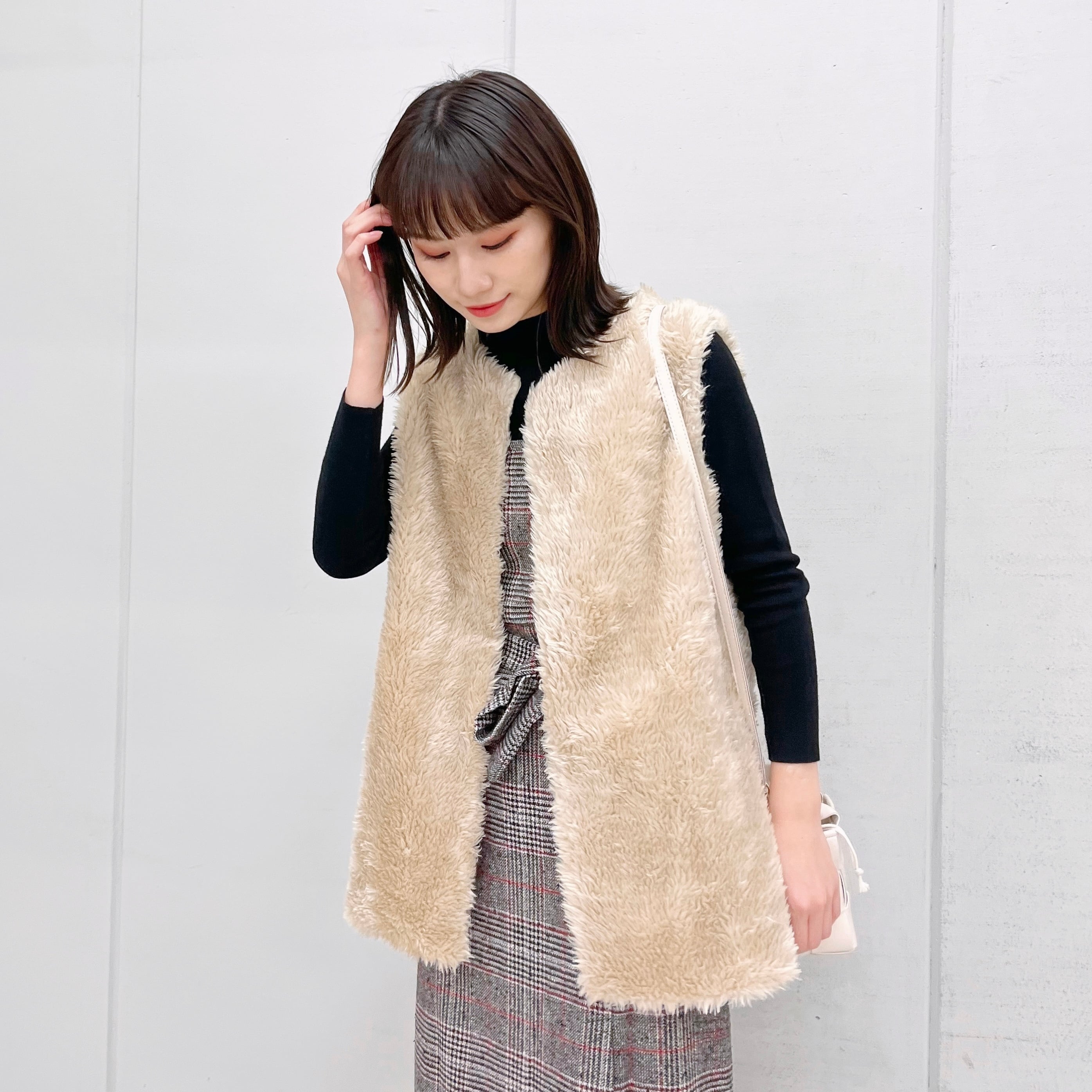 ボリュームのあるファーがコーディネートのポイントにぴったりのファーベスト。