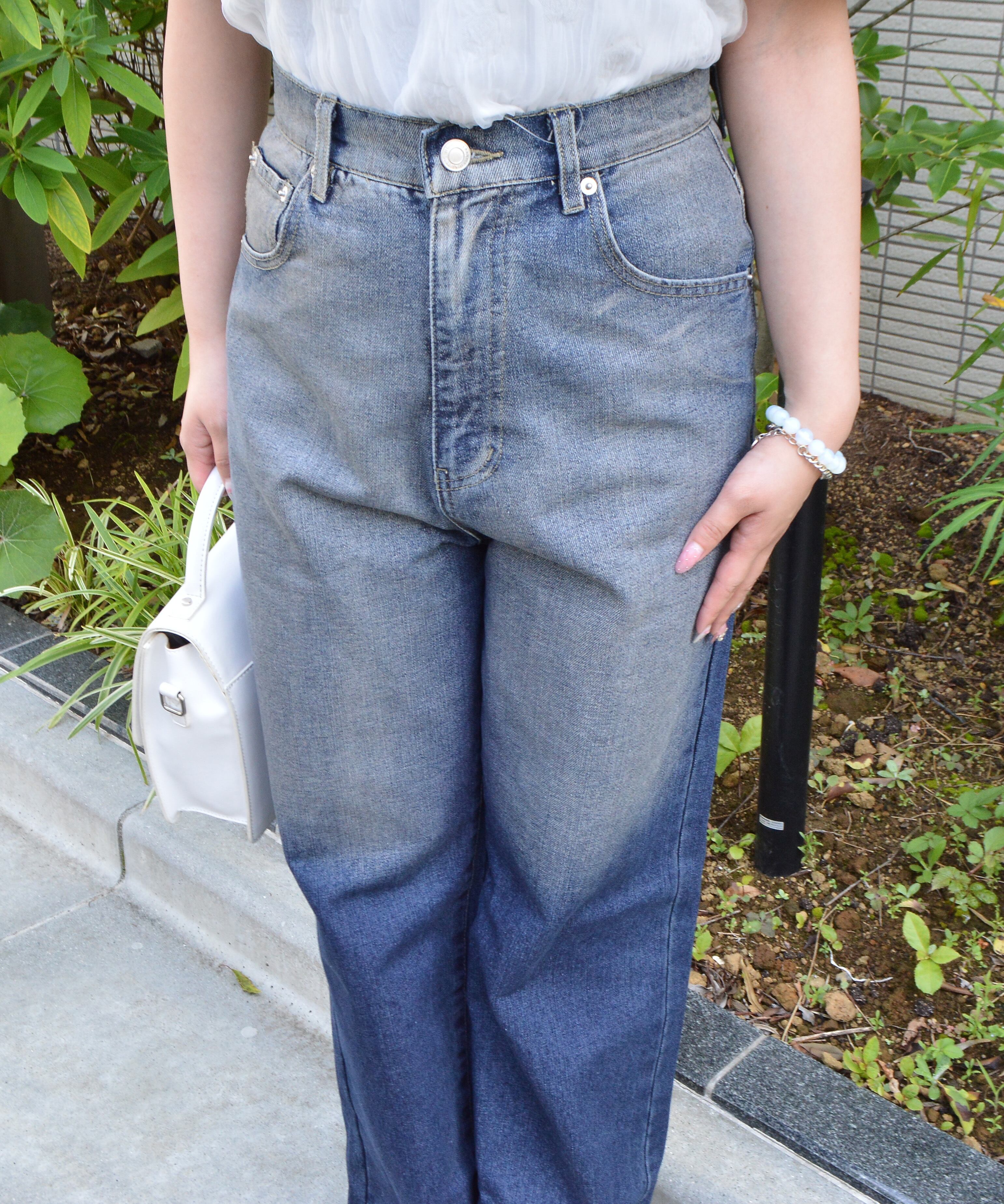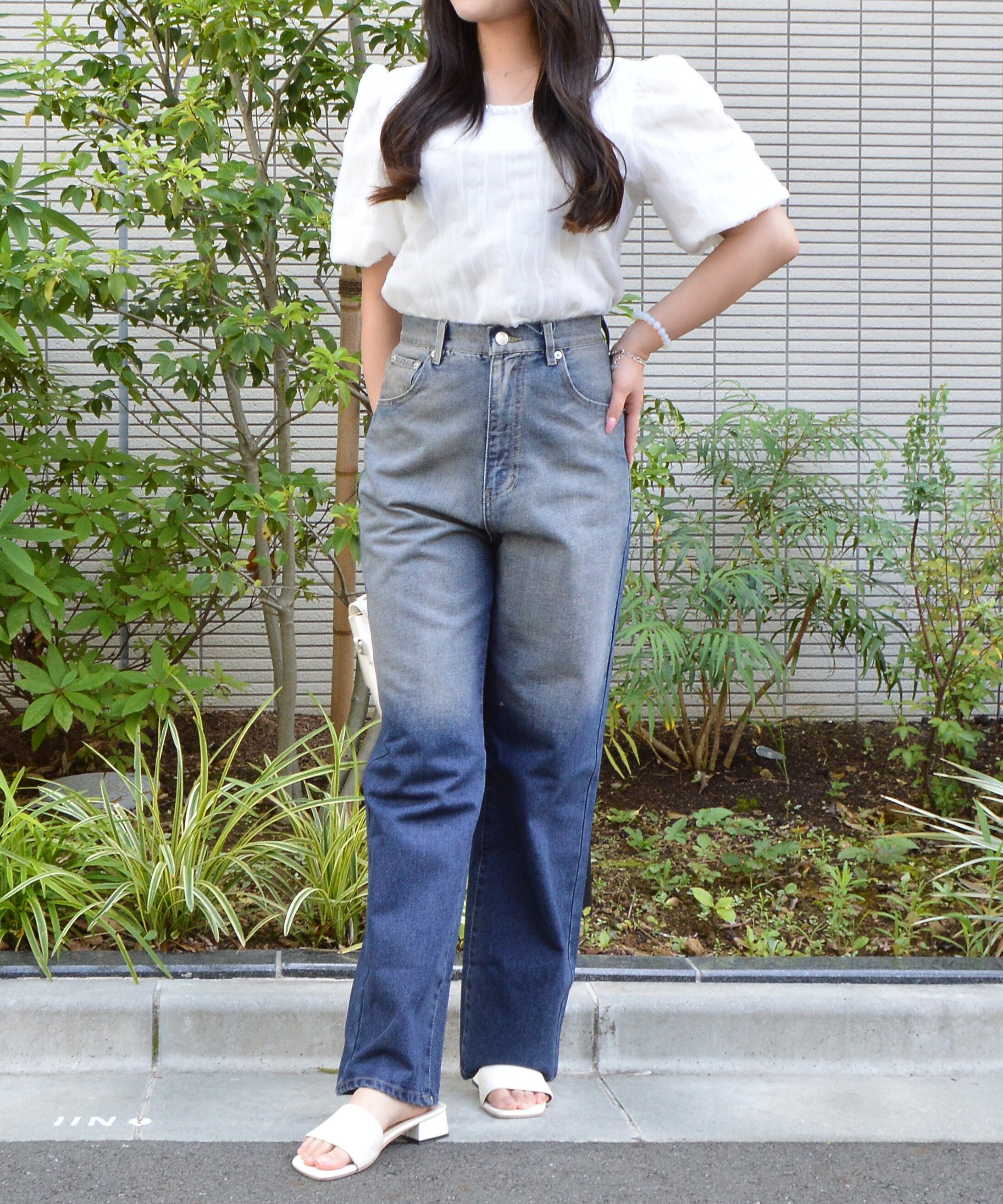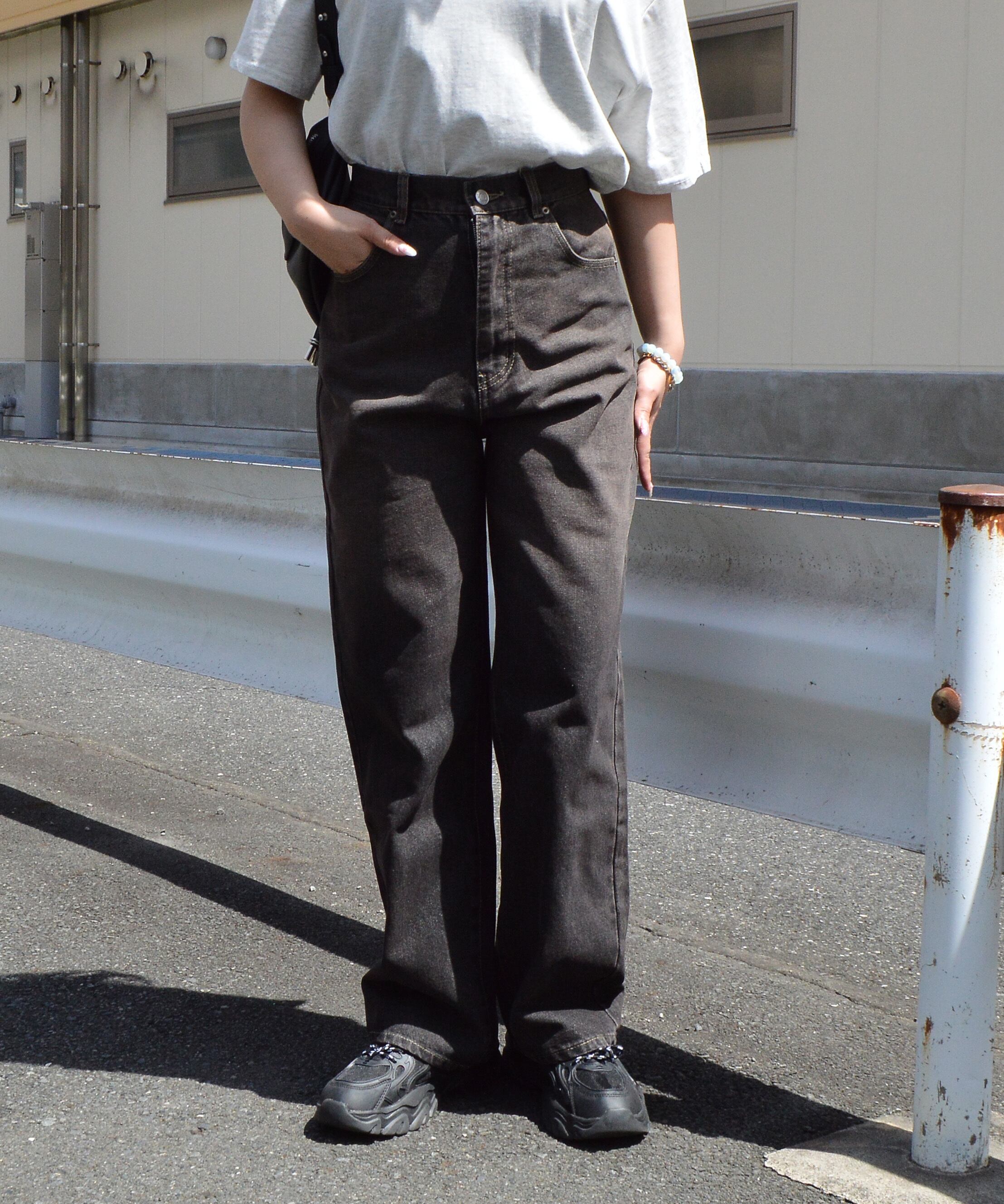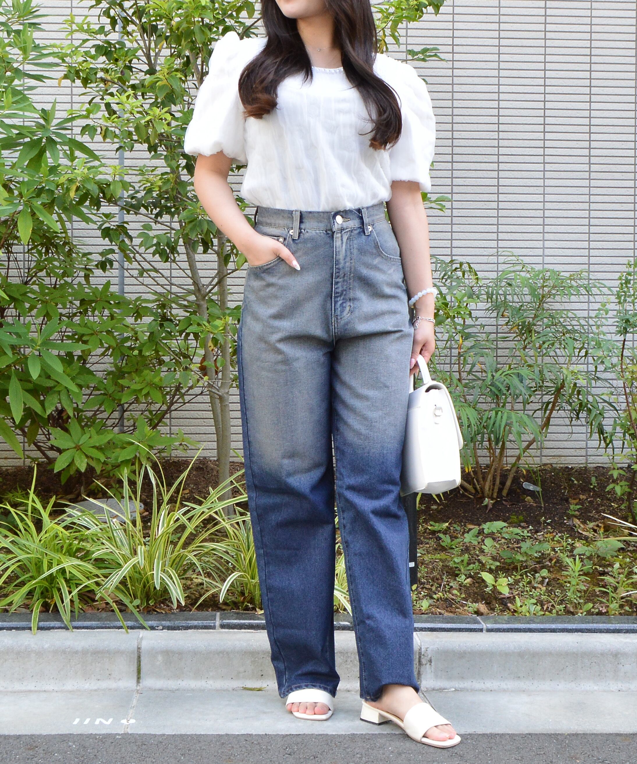 ・デニムの存在感が抜群なので、トップスは短丈Tシャツがオススメ!