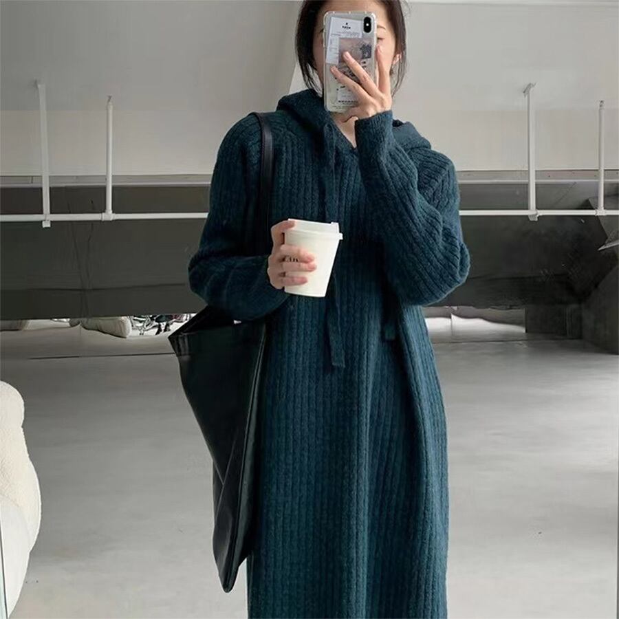 カジュアル 大人 フード ニットワンピース ニットワンピ ひざ丈 上品 きれいめ 長袖 ワンマイルウェア 散歩 お出かけ