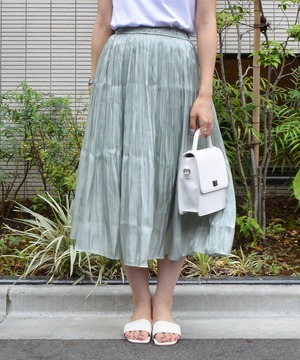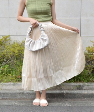 ギャザーデザインとグロッシーな光沢生地が高級感溢れるミディ丈スカート。