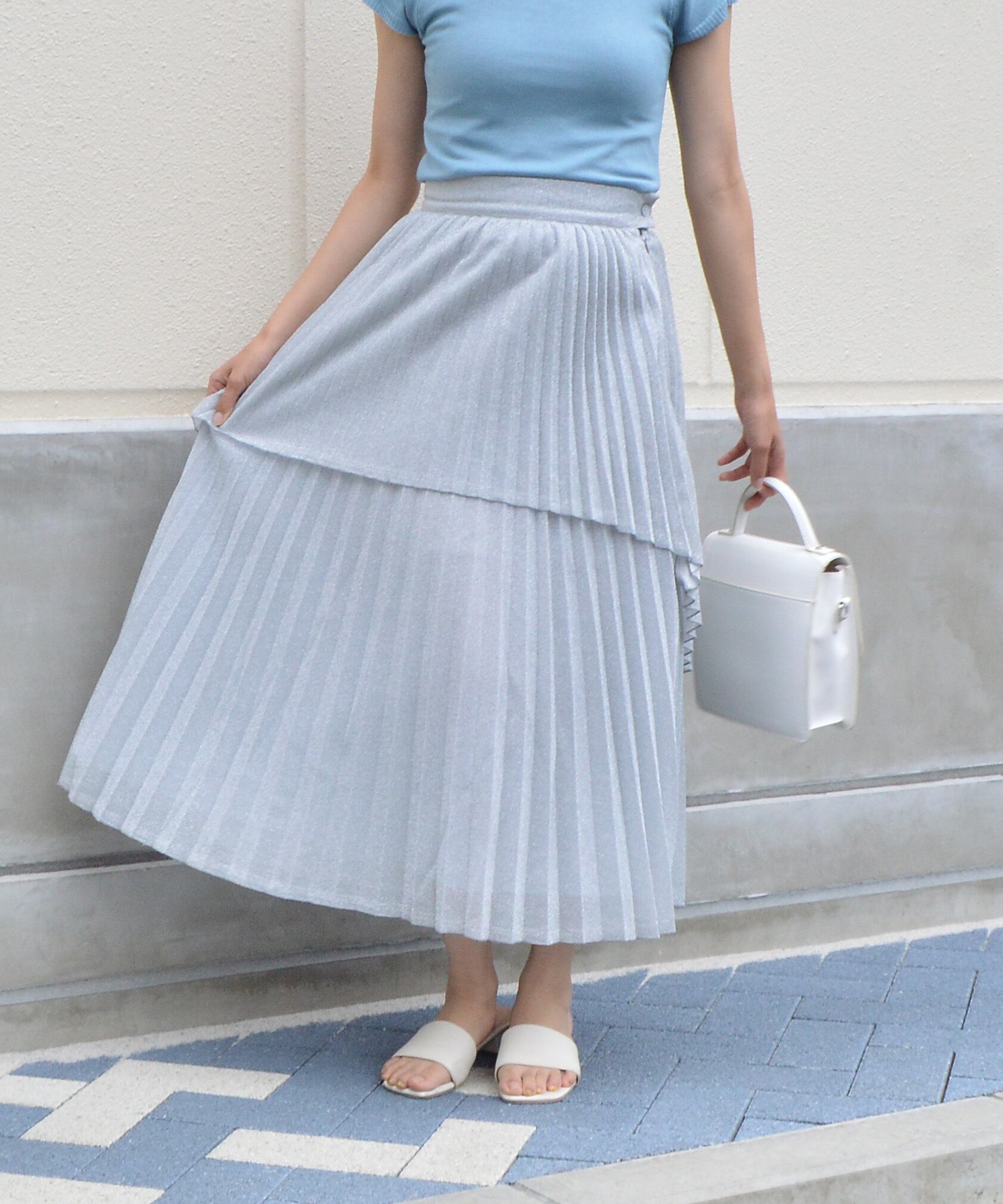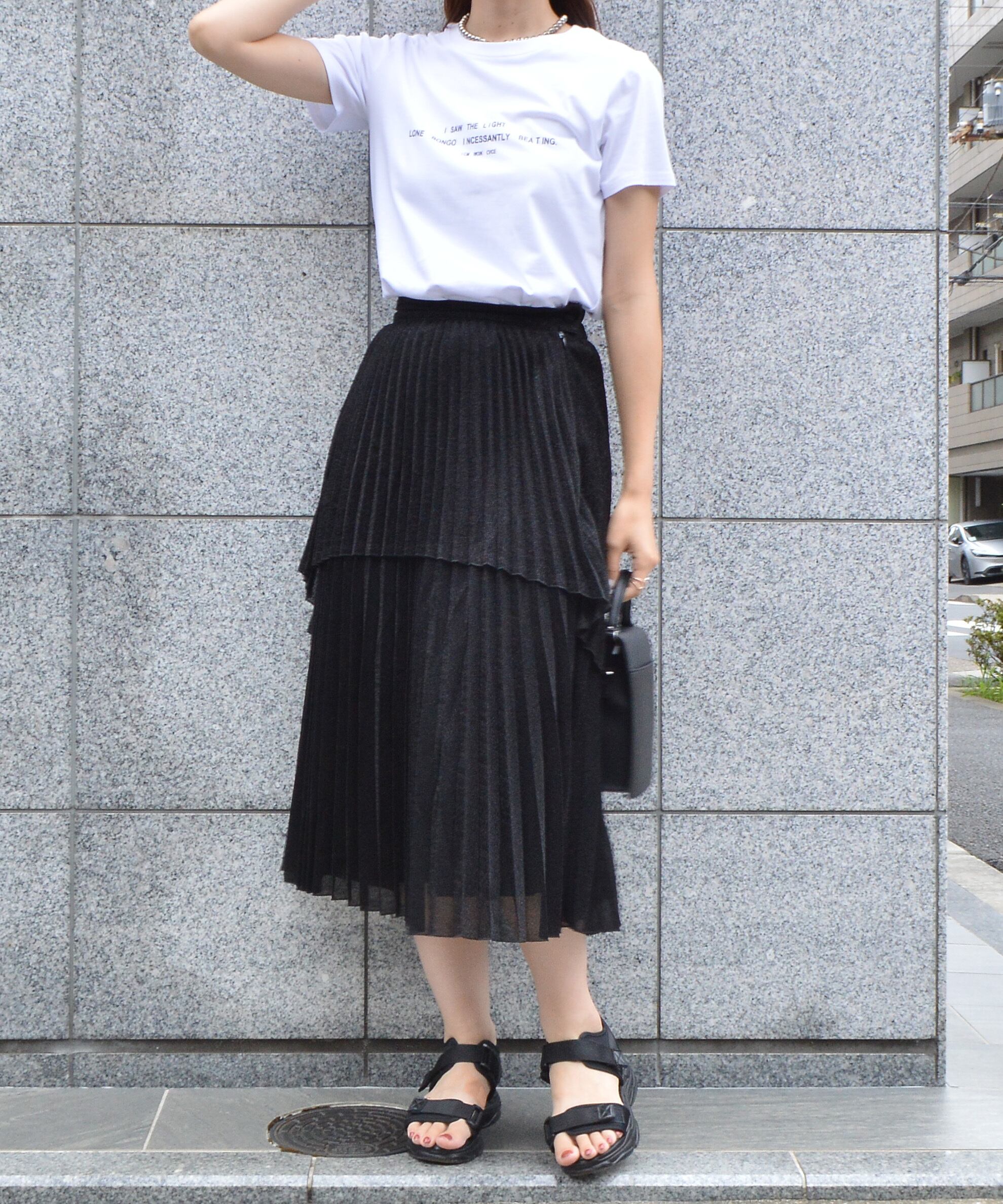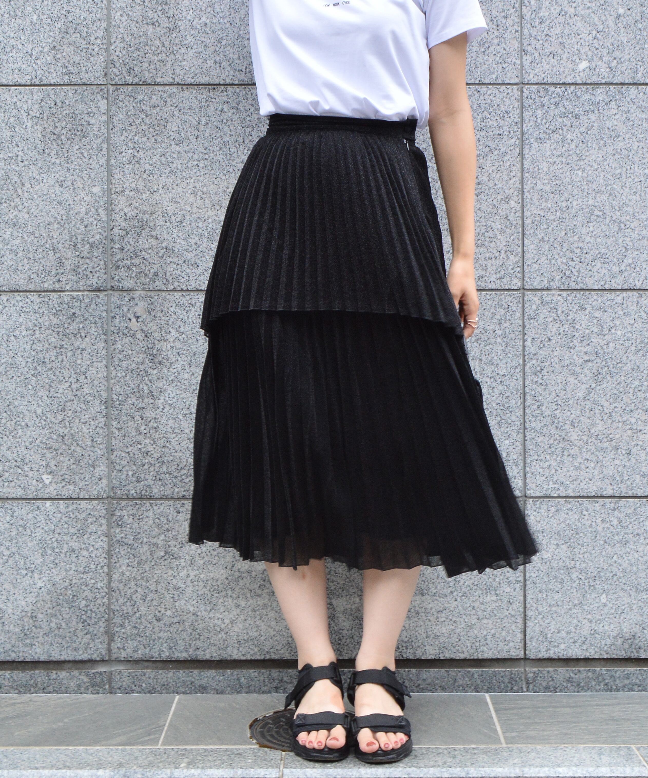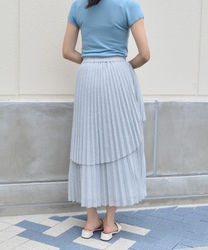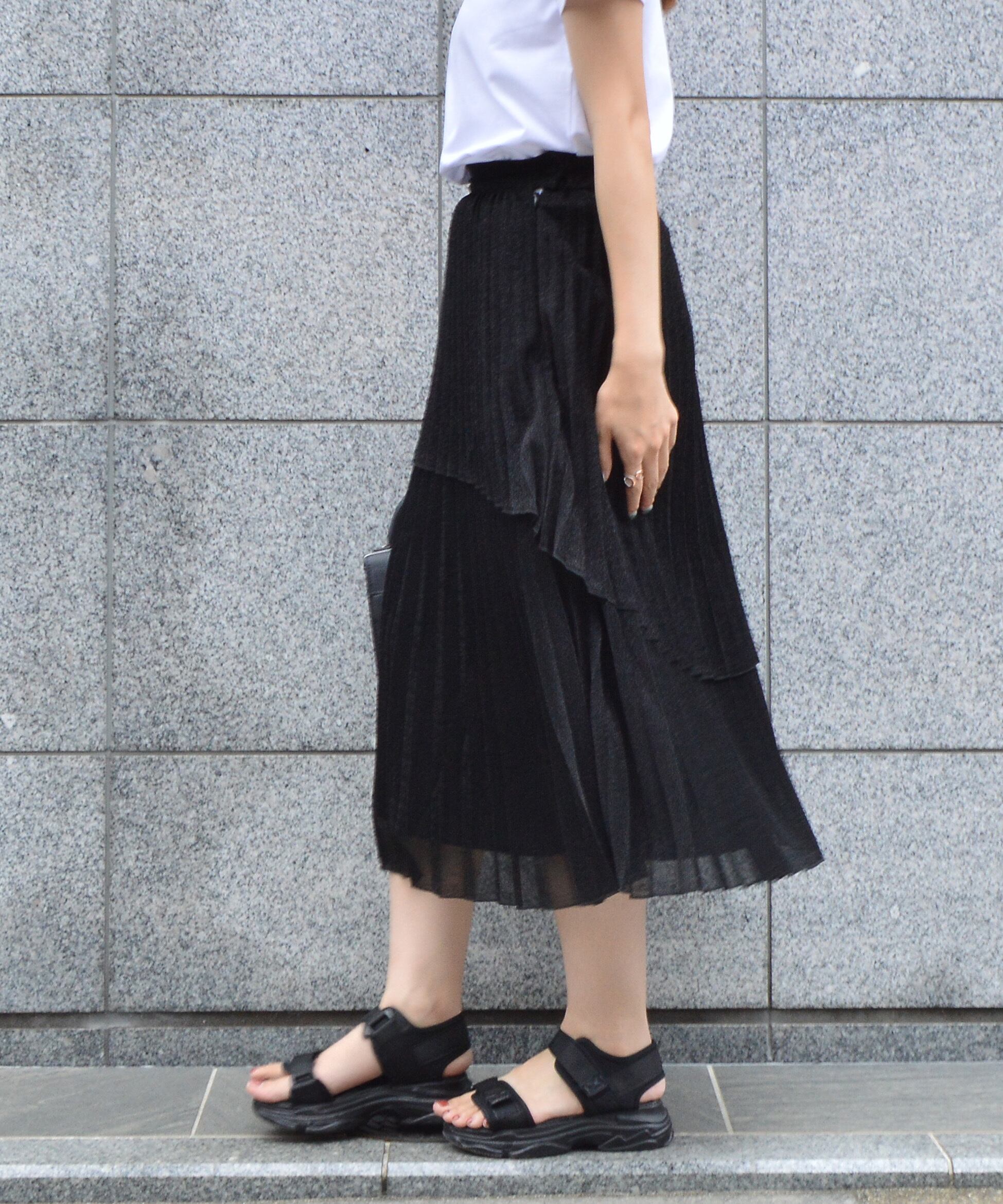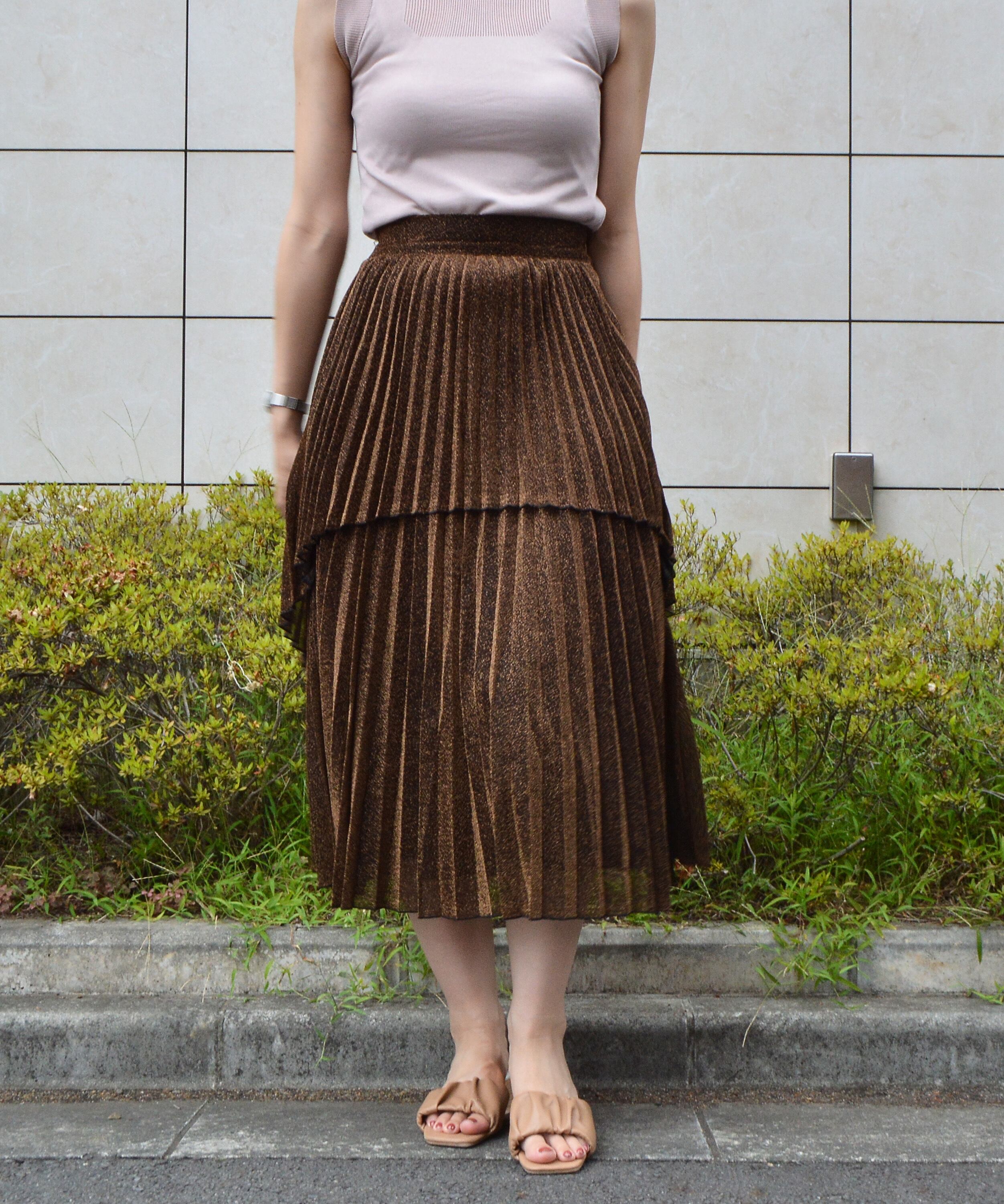 【ラメの光沢感とアシンメトリーなフロントデザインがポイント。ふわっと広がるプリーツが大人なコーデを演出】