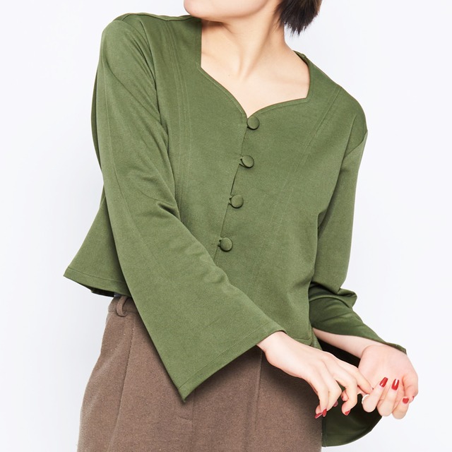 ・ハートネックと小ぶりなくるみボタンが可愛らしい印象を与えてくれます。