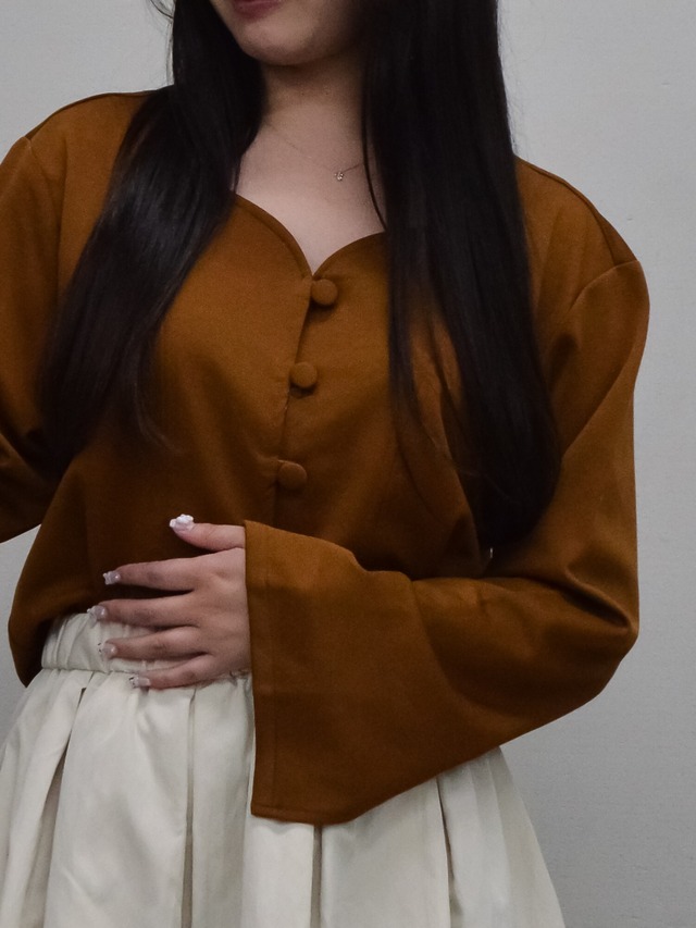 【エスニックな印象のくるみボタンにハートネックを合わせた可愛らしいカーディガン】
